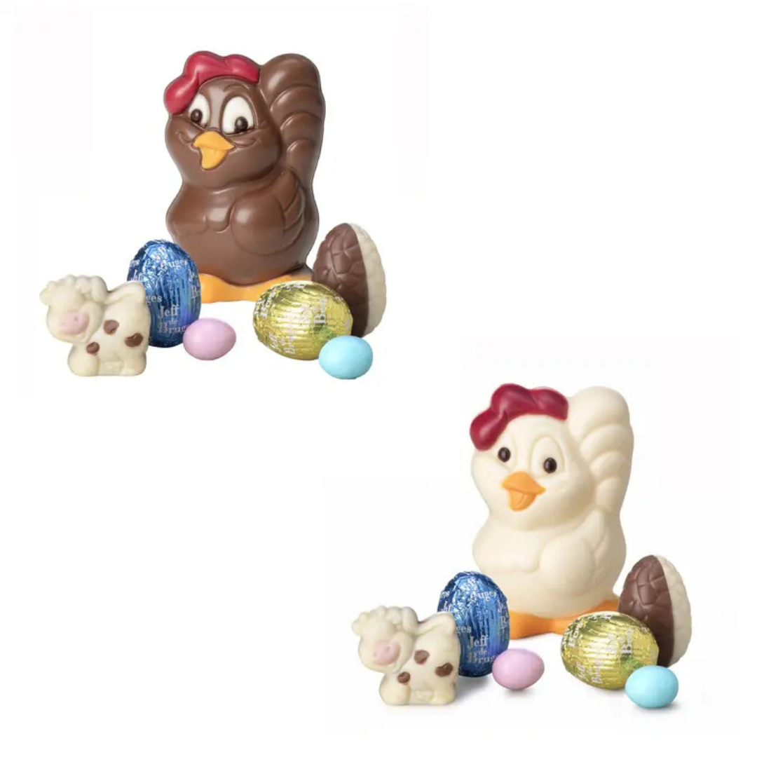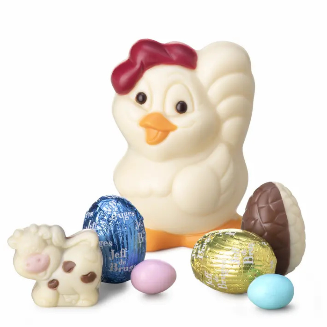 Les animaux de Pâques en chocolat sont un incontournable pour une chasse aux oeufs mémorable ! Marcel, le charmant coq est prêt pour la chasse aux oeufs. Ce sujet en chocolat blanc accompagné de ses petits chocolats fourrés, fera un beau cadeau pour petits et grands.